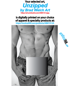 The artwork you selected, AB1012 UNZIPPED by BRAD WELCH ART is artwork digitally printed in the USA onto the garment or bag style of your choice, using Direct to Garment printing technology: T-Shirt, Tank Top, Sleeveless Shirt & Muscle Shirt, Hooded sweatshirts (pull-over & zip-up), Hand-Made Denim Jackets, Bags (drawstring, beach, shopping, totes, convention, jumbo)
