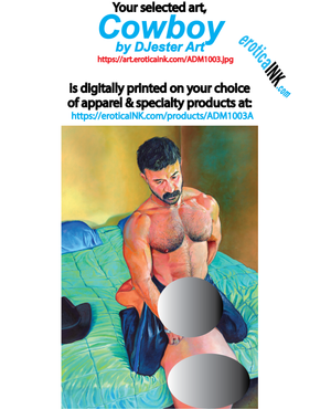 The artwork you selected, ADM1003 COWBOY by DJESTER ART is artwork digitally printed in the USA onto the garment or bag style of your choice, using Direct to Garment printing technology: T-Shirt, Tank Top, Sleeveless Shirt & Muscle Shirt, Hooded sweatshirts (pull-over & zip-up), Hand-Made Denim Jackets, Bags (drawstring, beach, shopping, totes, convention, jumbo)