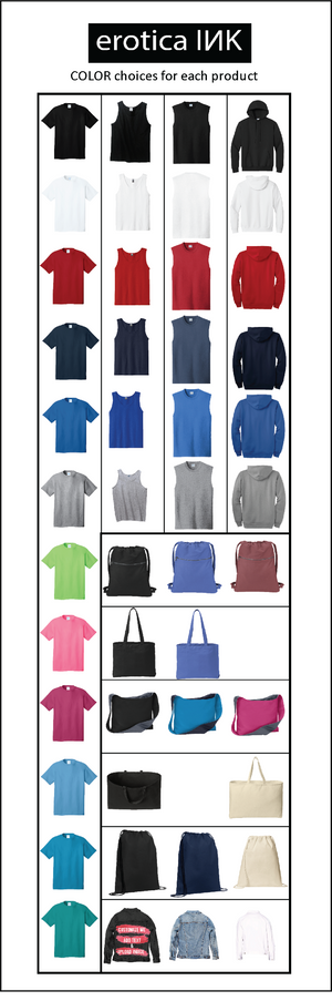 Available in multiple colors: Black, White, Navy, Red, Blue, and more. Check out our chart of color choices