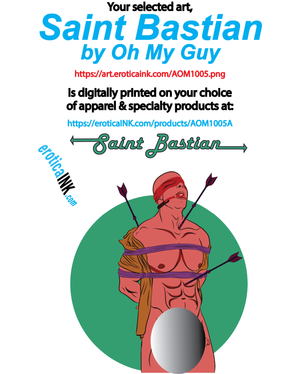 The artwork you selected, AOM1005, SAINT BASTIAN, by OH MY GUY is artwork digitally printed in the USA onto the garment or bag style of your choice, using Direct to Garment printing technology: T-Shirt, Tank Top, Sleeveless Shirt & Muscle Shirt, Hooded sweatshirts (pull-over & zip-up), Hand-Made Denim Jackets, Bags (drawstring, beach, shopping, totes, convention, jumbo)