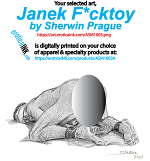 The artwork you selected: ASM1003 JANEK F*CKTOY by SherwinPrague is artwork - digitally printed in the USA onto the garment or bag style of your choice, using Direct to Garment printing technology: T-Shirt, Tank Top, Sleeveless Shirt & Muscle Shirt, Hooded sweatshirts (pull-over & zip-up), Hand-Made Denim Jackets, Bags (drawstring, beach, shopping, totes, convention, jumbo)