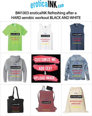 Your selected artwork, BM1003 ertoicaINK's REFRESHING AFTER A HARD AEROBIC WORKOUT BLACK AND WHITE is BDSMdungeonSIR' s artwork -digitally printed in the USA onto the garment or bag style of your choice, using Direct to Garment printing technology: T-Shirt, Tank Top, Sleeveless Shirt & Muscle Shirt, Hooded sweatshirts (pull-over & zip-up), Hand-Made Denim Jackets, Bags (drawstring, beach, shopping, totes, convention, jumbo)